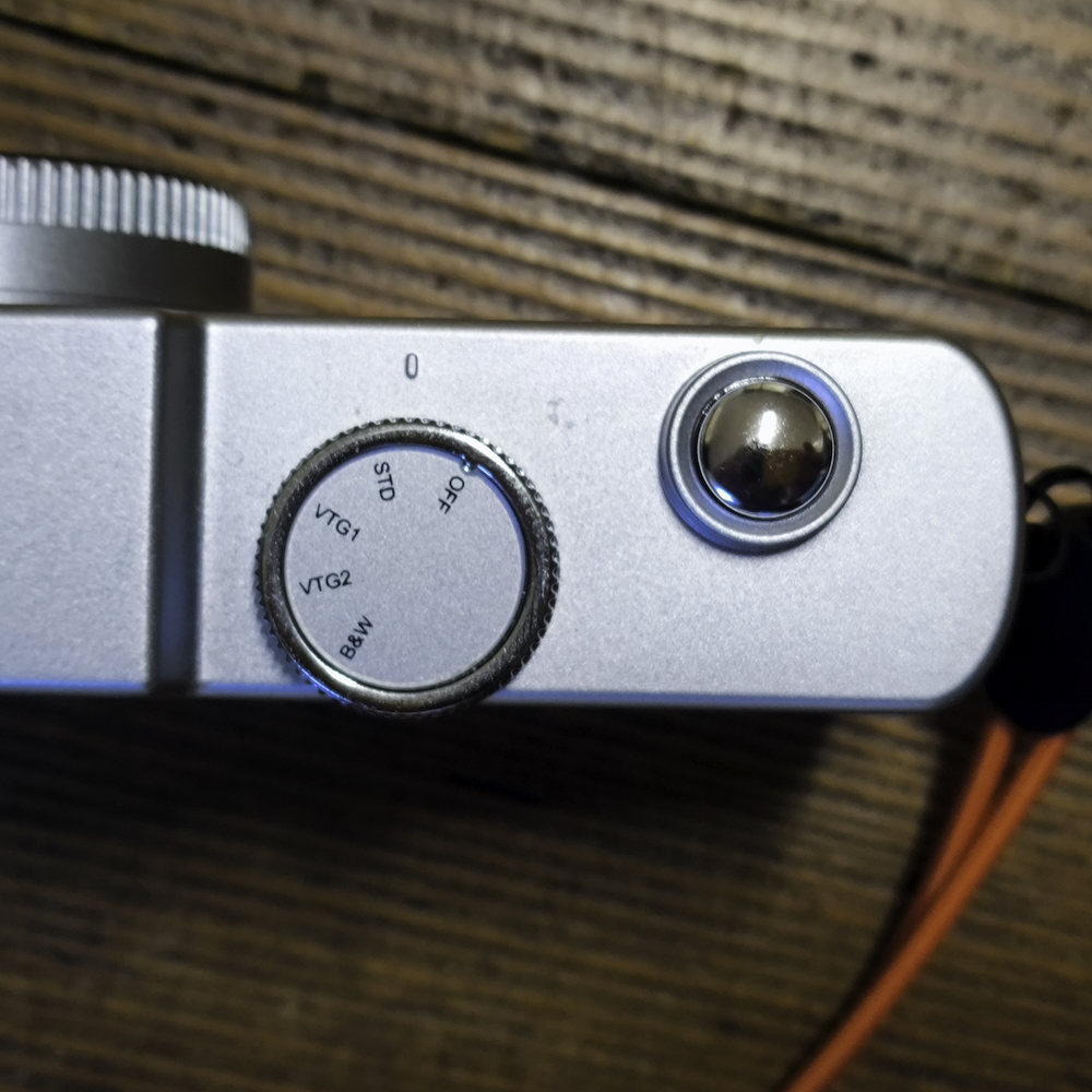 Eine wie ich finde, beste Neuerung, ist das Moduswahlrad oben auf der Kamera. Jetzt muss man nicht mehr umständlich die Kamera am Rechner anschließen, um den neuen Modus auszuwählen. Man hat dadurch eine neue Freiheit im Umgang mit dieser Kamera. Die vier Einstellungen bestehen aus “Standard, Vintage 1, Vintage 2 und Black & White. Zusätzlich ist dort auch der Ein-Ausschalter hinterlegt.