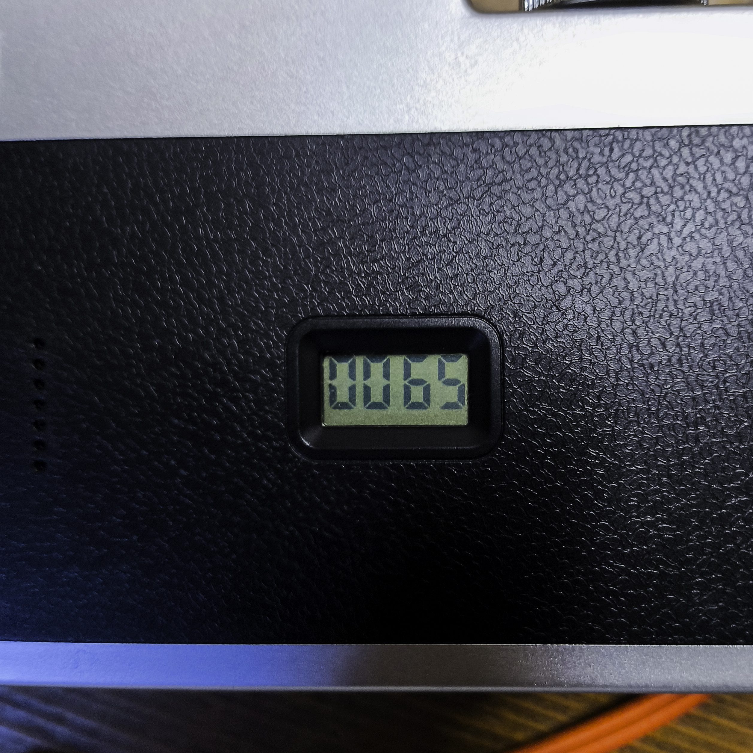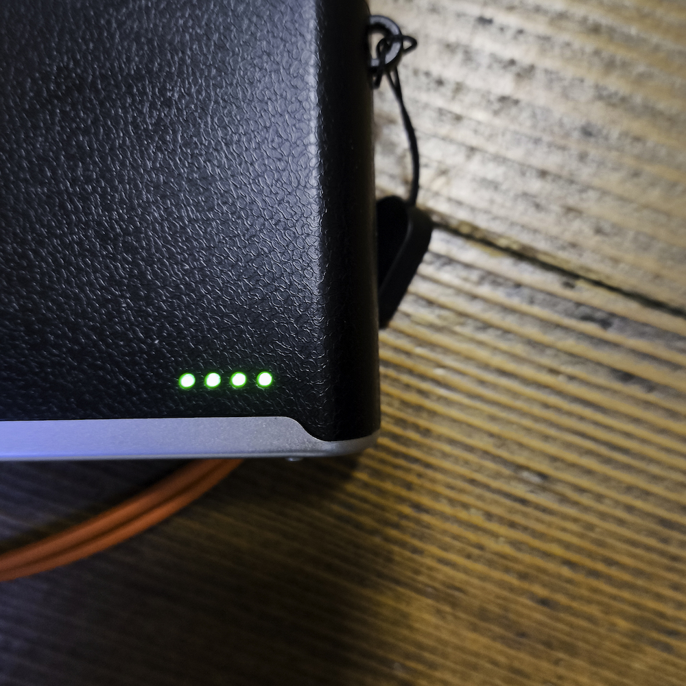 Auf der Rückseite wird mit vier grünen LED´s der Akkustand angezeigt und auf dem kleinen LCD in der Mitte sieht man die Anzahl der schon gemachten Bilder.