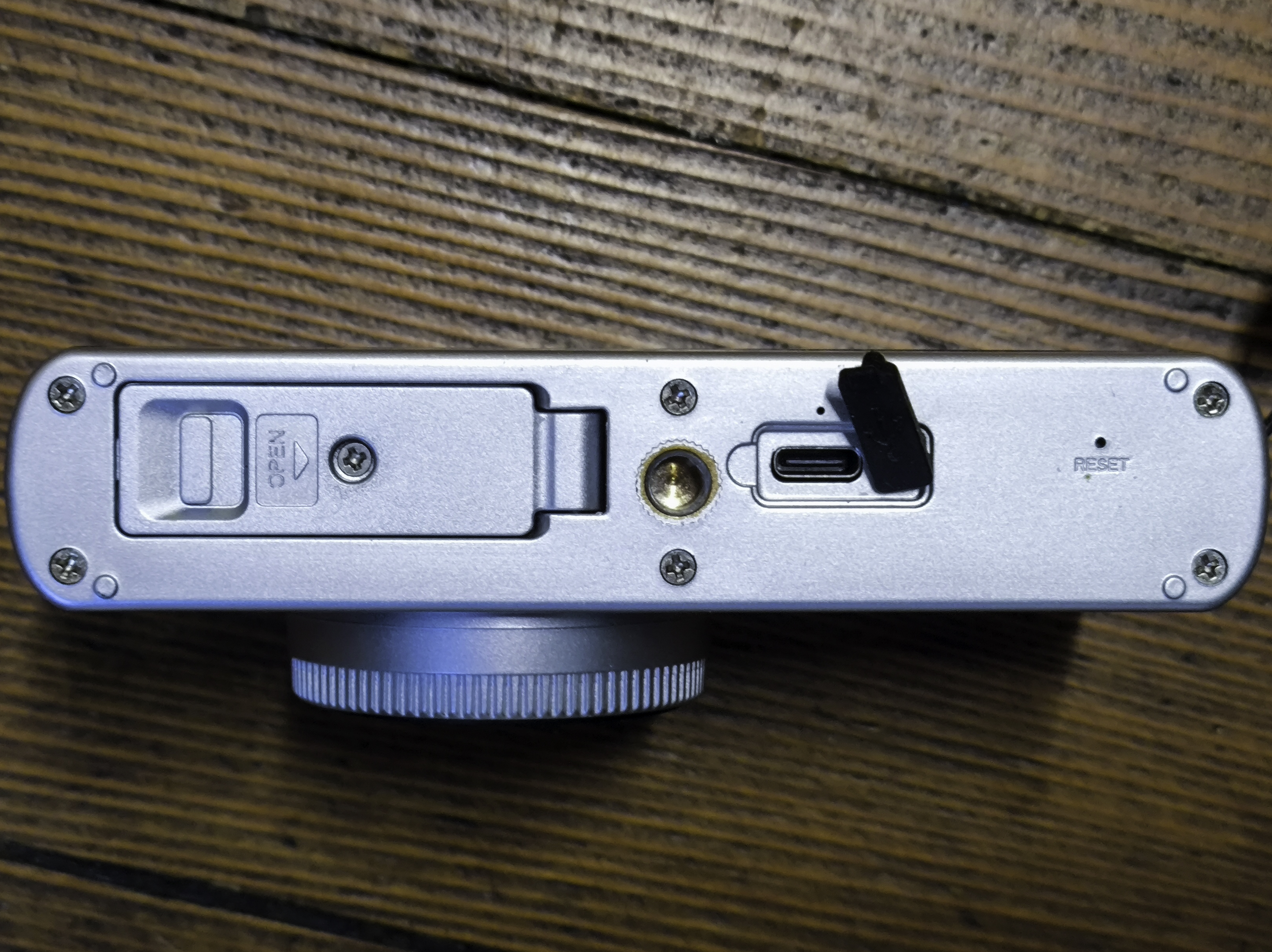 Auf der Unterseite ist der USB-C Anschluss zum Laden vom Akku und zur Übertragung der Bilder auf ein Smartphone, oder dem Computer daheim. Hinter der verschraubten Klappe verbirgt sich sich die 4 Gigabyte Micro-SD-Karte. Ausserdem verbergen sich dort die Knöpfe zur Einstellung. Dort kann man wie gesagt, den Auslöseton deaktivieren.